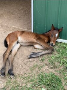 As my daughter prepared for her lesson, the foal wandered about. Her legs were shaky, ribs visible, and the weight of loss seemed to hang on her small frame. I reached out, stroking her side. To my surprise, she stayed. Then she folded down onto the ground near me and stretched out. I moved closer and started to gently pet the foal. I could feel her body relax, and she fell asleep leaning against me.
